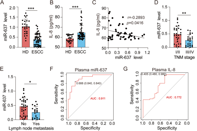 研究过程详述:组织样本来源于49例接受手术治疗的ESCC患者,血浆样本来源于50例ESCC患者与25例健康对照;验证方法包括实时荧光定量PCR检测miR-637的表达水平,Kaplan-Meier生存分析评估预后价值,ROC曲线分析诊断效能;特异性与敏感性方面,血浆miR-637的ROC曲线AUC=0.911,显示出较高的诊断效能,但原文未明确给出具体的敏感性与特异性数值;组织中低miR-637表达与ESCC患者的不良预后相关,但原文未提及风险比(HR)的具体数值。