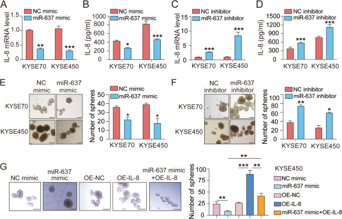 方法细节:在KYSE70与KYSE450细胞中转染miR-637模拟物或抑制剂,通过实时荧光定量PCR与酶联免疫吸附试验(ELISA)分别检测IL-8在mRNA与蛋白水平的表达变化;采用无血清干细胞培养基培养转染后的细胞,进行肿瘤球形成实验,培养5~7天后计数肿瘤球数量以评估干细胞特性;构建稳定过表达IL-8的KYSE450细胞系,转染miR-637模拟物后,通过肿瘤球形成实验验证IL-8在miR-637调控干细胞特性中的介导作用。