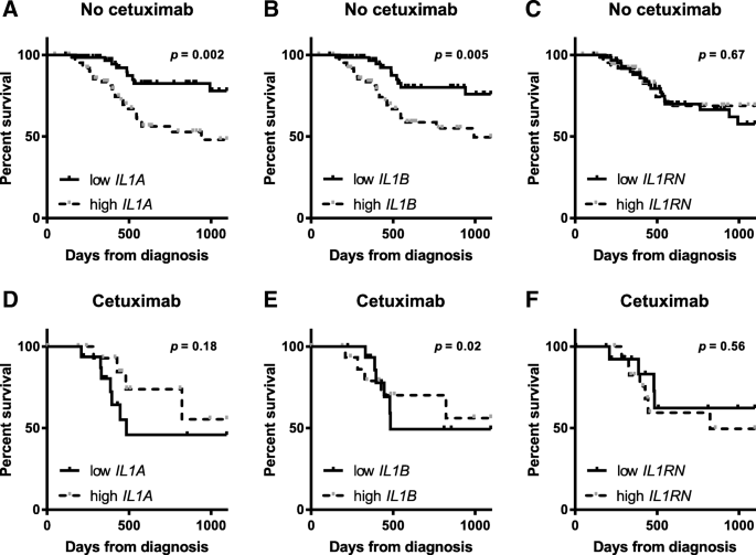 实验目的是明确HNSCC肿瘤组织中IL-1配体的表达特征及其与西妥昔单抗治疗预后的关联。方法是从TCGA数据库下载HNSCC的基因表达和临床数据,纳入164例有治疗信息的患者,分为西妥昔单抗治疗组(n=34)和非西妥昔单抗治疗组(n=130),分析肿瘤组织IL-1α、IL-1β、IL-1RA的表达差异及与总生存期的关联;同时对比42例患者的肿瘤与癌旁正常组织表达。结果显示,HNSCC肿瘤组织中IL-1α(n=42,P<0.0001)和IL-1β(n=42,P=0.003)的基因表达显著高于癌旁正常组织,IL-1RA表达显著降低(n=42,P=0.02);在非西妥昔单抗治疗组中,IL-1α和IL-1β高表达与更差的总生存期相关(P=0.002和P=0.005),而在西妥昔单抗治疗组中,IL-1β高表达与更优的总生存期相关(P=0.02),IL-1α高表达也呈现更优预后的趋势(P=0.18)。产品关联:文献未提及具体实验产品,领域常规使用生物信息学分析工具(如UCSC Xena、GraphPad Prism)进行数据库挖掘和统计分析。