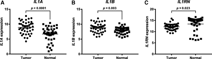 本研究中涉及的Biomarker为白细胞介素-1α(IL-1α)和白细胞介素-1β(IL-1β),属于细胞因子类预测性生物标志物,其筛选验证逻辑为“TCGA数据库肿瘤组织表达筛选→临床肿瘤样本基因表达验证→血清样本循环水平验证→细胞/动物实验机制验证”的完整链条,从数据库到临床样本再到机制研究,逐步验证其作为预测标志物的潜力。