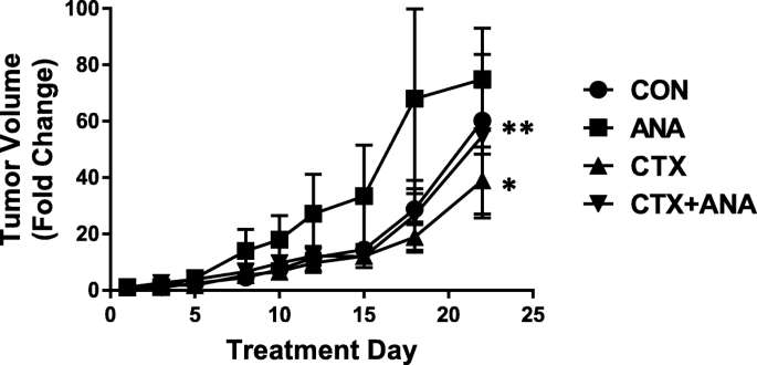 实验目的是在体内验证IL-1通路对西妥昔单抗抗肿瘤疗效的调控作用。方法是构建SQ20B细胞的裸鼠异种移植模型,分为对照组、西妥昔单抗组、西妥昔单抗+anakinra组,给药3周后每周三次监测肿瘤体积。结果显示,西妥昔单抗组肿瘤体积显著小于对照组(P<0.05),而西妥昔单抗+anakinra组的肿瘤体积显著大于西妥昔单抗组(P<0.05),提示阻断IL-1通路可部分逆转西妥昔单抗的抗肿瘤疗效。产品关联:文献未提及具体实验产品,领域常规使用免疫缺陷裸鼠构建异种移植模型,采用游标卡尺测量肿瘤体积。