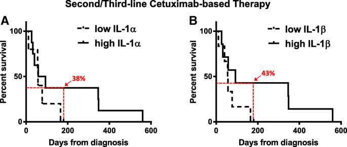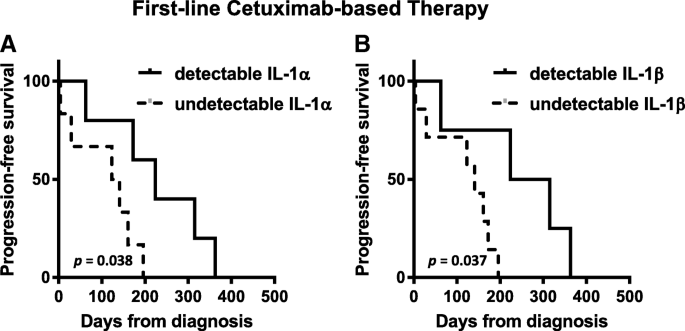 Biomarker的来源包括HNSCC患者的肿瘤组织和外周血清样本,验证方法分别为基于RNA测序的基因表达分析、基于酶联免疫吸附实验(ELISA)的血清蛋白定量检测。在肿瘤组织中,IL-1α和IL-1β的基因表达显著高于癌旁正常组织;在西妥昔单抗治疗患者中,高表达的IL-1β与更优总生存期相关(n=34,P=0.02),高表达的IL-1α与更长PFS相关(n=40,FDR校正P=0.007)。在血清样本中,可检测到IL-1α的患者PFS显著长于未检测到的患者(n=5 vs n=6,P=0.038),可检测到IL-1β的患者PFS也显著更长(n=4 vs n=7,P=0.037);在西妥昔单抗耐药患者中,高IL-1配体水平的患者6个月生存率更高,生存曲线呈现晚期分离趋势。