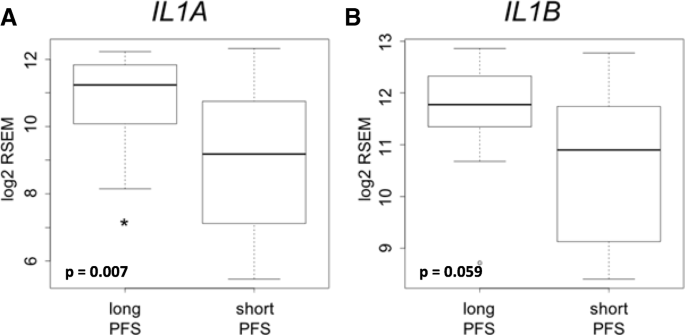 实验目的是验证IL-1配体基因表达与西妥昔单抗联合化疗患者无进展生存期(PFS)的关联。方法是回顾性分析40例接受一线西妥昔单抗联合化疗的R/M HNSCC患者的术前肿瘤活检样本基因表达数据,分为长PFS组(>12个月,n=14)和短PFS组(<5.6个月,n=26),采用LIMMA软件进行差异表达分析。结果显示,长PFS组的IL-1α基因表达显著高于短PFS组(FDR校正P=0.007),IL-1β表达也呈现更高趋势(FDR校正P=0.059)。产品关联:文献未提及具体实验产品,领域常规使用Illumina表达芯片进行基因表达检测,LIMMA软件进行差异分析。