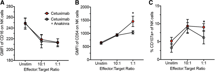实验目的是明确IL-1通路对西妥昔单抗诱导的NK细胞活性的影响。方法是将人外周血单个核细胞(PBMC)与经西妥昔单抗±IL-1受体拮抗剂(anakinra)处理的SQ20B细胞共培养6小时,采用流式细胞术检测NK细胞(CD3-)的CD16、CD54(激活标志物)和CD107a(脱颗粒标志物)表达。结果显示,anakinra抑制了西妥昔单抗诱导的NK细胞CD54表达和CD107a脱颗粒(P<0.05),但不影响CD16表达,提示IL-1信号对西妥昔单抗诱导的NK细胞激活至关重要。产品关联:实验所用关键产品:BD的抗CD3、CD16、CD54、CD107a流式抗体,FACSCanto流式细胞仪。