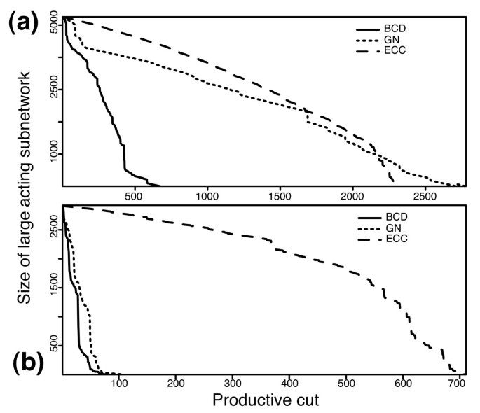 作者按算法依赖的拓扑指标类型(全局、局部)对现有蛋白质相互作用网络分解方法进行分类评述,清晰梳理了不同方法的优势与局限性。现有全局指标算法以Girvan-Newman(GN)算法为代表,通过迭代移除边介数最高的边实现网络分解,其优势在于能从全局层面识别模块间的连接瓶颈,精准划分结构差异显著的模块,但该算法计算复杂度高(O(M²N),M为边数、N为节点数),且对网络中的假阳性相互作用敏感,易将真实功能模块误拆分;局部指标算法以边聚类系数(ECC)算法为代表,通过移除边聚类系数最低的边进行分解,优势在于计算速度较快,能有效捕捉模块内的紧密连接模式,但仅依赖局部拓扑信息,易将模块边缘蛋白误判为孤立节点,产生大量无功能意义的单蛋白节点,且难以识别跨模块的功能关联。此外,基于随机流的MCL算法虽在大规模网络中表现出较好的聚类效率,但难以精准界定模块边界,易将功能相关的不同复合物合并为一个大簇。通过对比现有算法的不足,本文的创新价值凸显:首次整合全局与局部拓扑指标,提出一致性分解算法,同时引入随机图模型过滤假阳性相互作用,解决了现有算法结果不一致、噪声耐受性差、模块边界模糊等核心问题,为蛋白质相互作用网络的功能解析提供了更可靠的方法学工具。