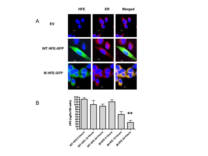 实验目的是验证C282Y HFE蛋白因折叠异常滞留内质网并发生降解。方法细节为构建带有GFP或His标签的野生型(WT)和C282Y突变体HFE表达载体,采用GeneJuice转染试剂将其转染至HEK293细胞,24小时后通过共聚焦显微镜观察GFP标记的HFE与内质网标志物钙连蛋白的共定位情况,同时用ELISA检测His标签的HFE蛋白水平。结果解读显示,共聚焦显微镜图像中C282Y HFE与钙连蛋白呈现黄色重叠信号,表明二者共定位于内质网,而WT HFE则主要分布于细胞膜区域;ELISA结果显示C282Y HFE蛋白水平显著低于WT HFE(n=3,P=0.0012),说明突变体蛋白因折叠异常滞留内质网并发生降解。