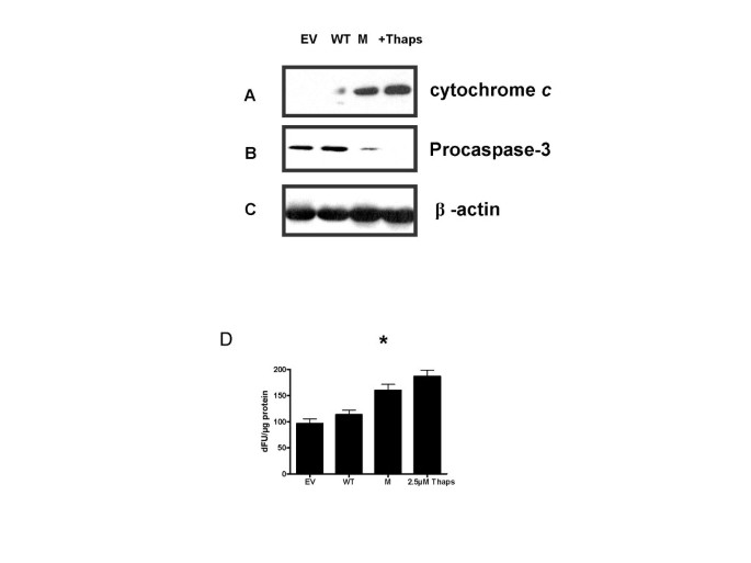 实验目的是验证C282Y HFE激活内质网应激后是否引发细胞凋亡。方法细节为转染WT或C282Y HFE载体,24小时后通过Western Blot检测细胞色素c的释放和caspase-3的激活情况;采用荧光底物法检测caspase-3的活性;同时检测bcl-2启动子荧光素酶活性以反映抗凋亡能力。结果解读显示,C282Y HFE组细胞色素c释放量显著增加,caspase-3激活水平明显高于WT组;荧光底物法检测显示C282Y HFE组caspase-3活性显著升高(n=3,P=0.0363);bcl-2荧光素酶活性显著降低(n=3,P=0.004),说明C282Y HFE通过内质网应激通路诱导细胞凋亡。
