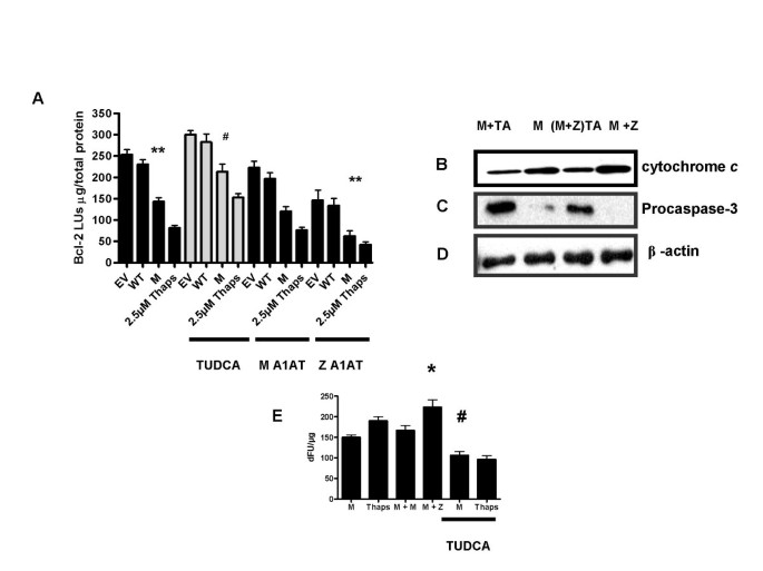 实验目的是明确TUDCA是否可抑制C282Y HFE诱导的细胞凋亡。方法细节为转染C282Y HFE载体后,用300μM TUDCA处理细胞,24小时后通过Western Blot检测细胞色素c释放和caspase-3激活情况;同时检测caspase-3活性和bcl-2荧光素酶活性的变化。结果解读显示,TUDCA处理后,细胞色素c释放量显著减少,caspase-3激活水平明显降低;caspase-3活性显著下降(n=3,P=0.0214),bcl-2荧光素酶活性显著升高(n=3,P=0.0238),表明TUDCA可通过上调抗凋亡分子表达、抑制凋亡执行分子激活来阻断C282Y HFE诱导的细胞凋亡。