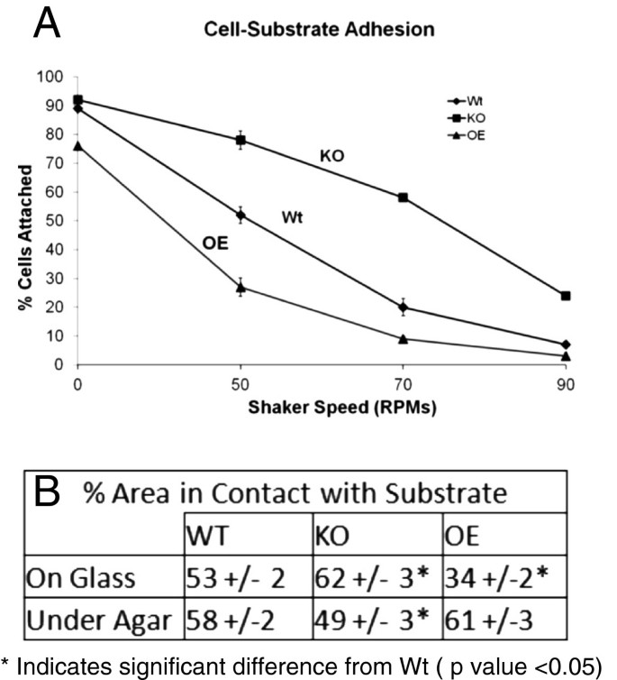 方法细节:采用摇床实验,将三组菌株接种于培养皿后,以不同转速摇床处理45分钟,检测剩余贴壁细胞的比例;同时采用反射成像技术,定量分析细胞与底物的接触面积占总细胞面积的比例。