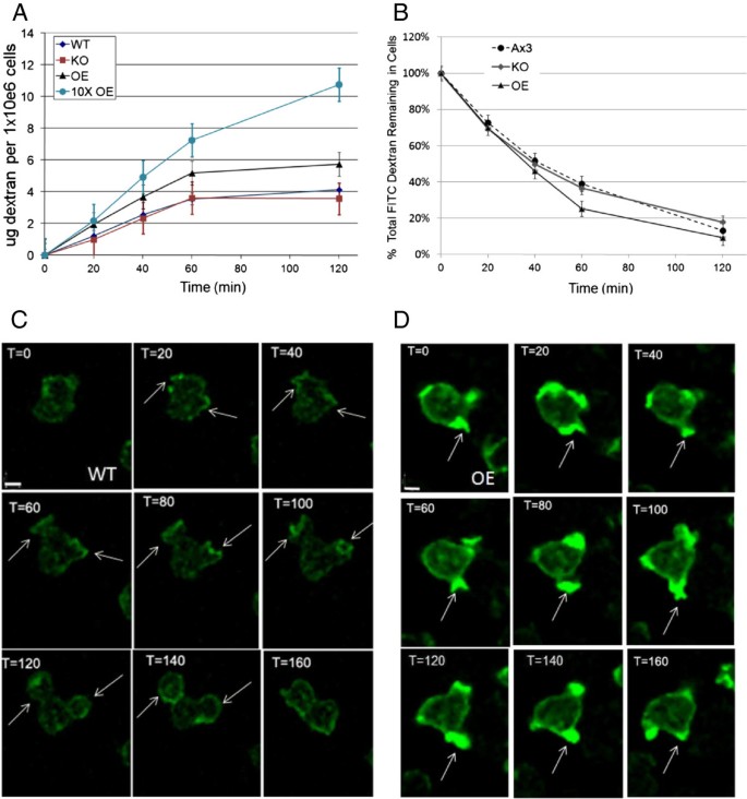 结果解读:OE菌株内吞速率显著高于Wt(OE1为5 μg/10^6细胞/小时,OE2为7 μg/10^6细胞/小时,Wt为3.5 μg/10^6细胞/小时,n=5,P<0.05),且49%的OE细胞会在同一部位重复形成内吞杯,而Wt仅8%的细胞出现该现象;KO菌株内吞速率与Wt无显著差异。