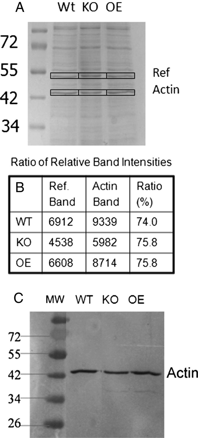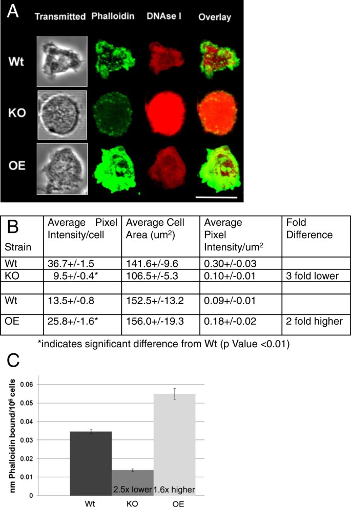 结果解读:定量分析显示,KO菌株F-肌动蛋白含量约为Wt的1/3(n=15-20,P<0.05),OE菌株F-肌动蛋白含量约为Wt的2倍(n=15-20,P<0.05);Western blot结果显示三组菌株的总肌动蛋白含量无显著差异,表明AmpA特异性调控肌动蛋白的聚合过程而非合成过程。