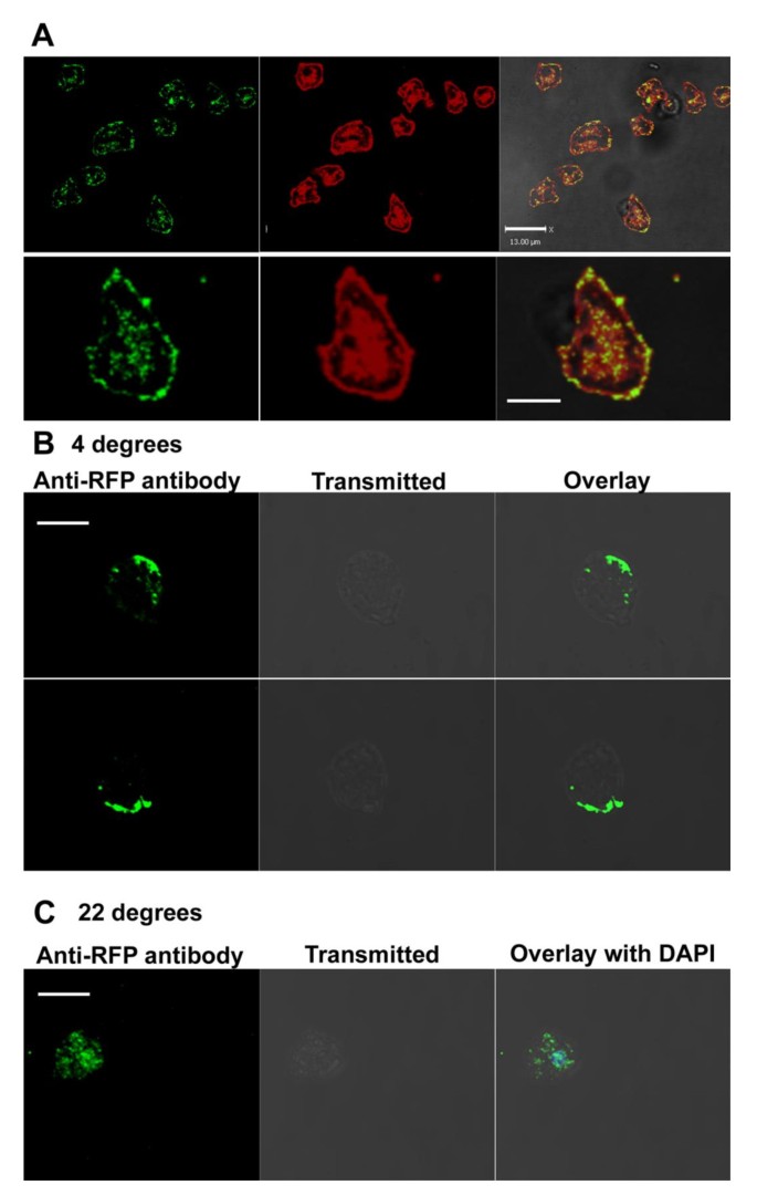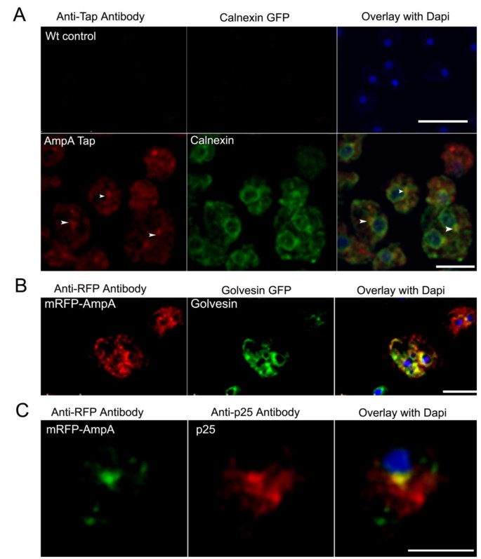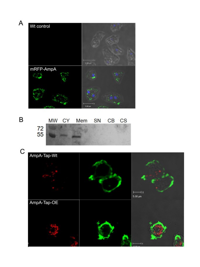 方法细节:构建AmpA-TAP标签、mRFP-AmpA融合蛋白表达菌株,采用免疫荧光染色结合共聚焦显微镜,与内质网标记物Calnexin、高尔基体标记物N-golvesin、内吞循环区室标记物p25进行共定位分析;同时采用活细胞DiI膜染色与抗体标记,检测AmpA在细胞膜的分布及内吞循环过程。