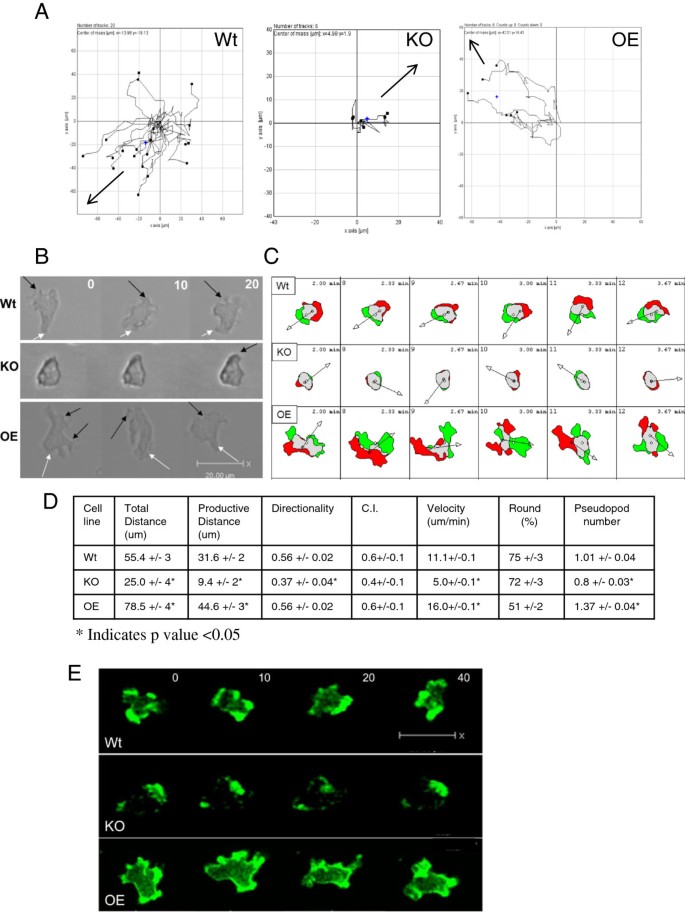 研究过程详述:AmpA来源于盘基网柄菌营养生长阶段的细胞内(不分泌至培养基),通过构建KO、OE突变株,结合细胞迁移、黏附、肌动蛋白聚合实验验证其功能;特异性表现为AmpA表达水平与细胞黏附能力负相关,与肌动蛋白聚合水平正相关;敏感性方面,AmpA表达量的微小变化即可显著改变细胞迁移能力(如KO菌株迁移速度较Wt降低60%,OE菌株较Wt升高45%,n=40-100,P<0.05)。