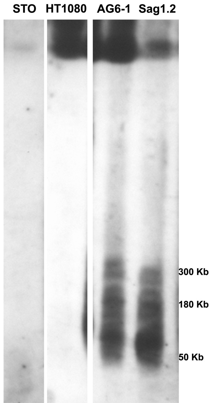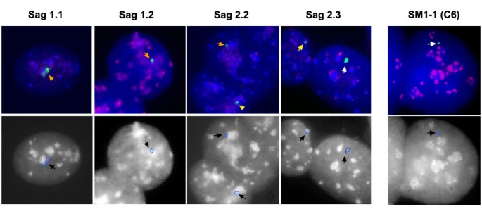 实验目的是获得来源于不同人类HAC的小鼠细胞系,排除细胞系背景差异,并分析HAC的结构变化是否影响稳定性。方法细节:将人类HT1080细胞中构建的LJ2-1(含17α卫星DNA)和AG6-1(含17α卫星DNA与HPRT基因座)HAC,通过微细胞介导染色体转移(MMCT)技术转移至STO小鼠胚胎成纤维细胞,经嘌呤霉素与G418筛选获得阳性克隆,分别命名为SM1-1(C6)(LJ2-1衍生物)、Sag1.1、Sag1.2、Sag2.2、Sag2.3(AG6-1衍生物);采用脉冲场凝胶电泳(PFGE)结合17α卫星DNA探针杂交分析HAC的结构,通过荧光原位杂交(FISH)检测克隆中是否存在小鼠DNA插入或人类其他染色体污染。结果解读:成功获得5株HAC阳性小鼠细胞系,FISH结果显示所有克隆均不含小鼠DNA插入或人类其他染色体污染;PFGE分析显示LJ2-1的衍生物SM1-1(C6)存在明显结构重排,而AG6-1的衍生物结构与亲本HAC无显著差异,说明结构重排可能是部分HAC不稳定的原因,但AG6-1衍生物的稳定性差异无法用结构解释。