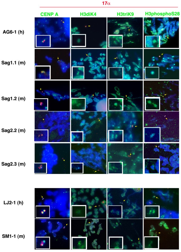 实验目的是确认HAC的着丝粒功能完整性与染色质组成是否正常,排除着丝粒蛋白缺失或染色质组成异常导致的稳定性差异。方法细节:采用免疫荧光原位杂交(Immuno-FISH)技术,在中期染色体标本上同时检测HAC的17α卫星DNA信号与着丝粒蛋白CENP-A、组蛋白修饰标记(常染色质标记组蛋白H3赖氨酸4二甲基化H3K4me2、异染色质标记H3K9me3、有丝分裂相关修饰H3丝氨酸10/28磷酸化)的荧光信号;使用ImageJ软件定量25个中期染色体上HAC的H3K9me3荧光强度,以小鼠19号染色体为参照计算相对比值,分析组内荧光强度的变异程度。结果解读:所有HAC均能结合CENP-A,且结合水平与人类或小鼠内源性染色体相当,说明着丝粒功能基本正常;所有HAC同时含有H3K4me2标记的常染色质与H3K9me3标记的异染色质结构,H3丝氨酸10/28磷酸化修饰水平也与内源性染色体一致,提示HAC的染色质组成无明显异常。
