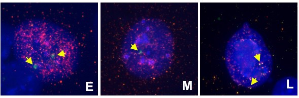 研究过程详述:HAC与染色中心的共定位比例来源于150个间期细胞的荧光原位杂交(FISH)检测结果,通过人工计数共定位细胞的比例获得;H3K9me3修饰的组内变异通过ImageJ定量25个中期染色体的荧光强度,计算相对比值的标准差获得;S期晚期复制比例来源于S期不同阶段BrdU标记后的荧光原位杂交(FISH)检测结果,统计晚S期阶段HAC已复制的细胞比例。特异性与敏感性方面,共定位比例与丢失率的相关性具有统计学显著性(P=0.0114),可有效区分稳定与不稳定的HAC克隆;H3K9me3组内变异与不分离事件的相关性显著(P=0.0255),可反映着丝粒功能的异质性;晚S期复制比例与丢失率的相关性显著(P=0.0343),可预测HAC的复制异常风险。