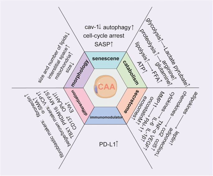 方法细节:综述整合了领域内多项研究的结果,涵盖形态学观察(电子显微镜分析)、转录组测序、代谢组学检测及细胞功能实验等技术手段,对比了正常脂肪细胞与CAAs的形态、基因表达谱及代谢状态。