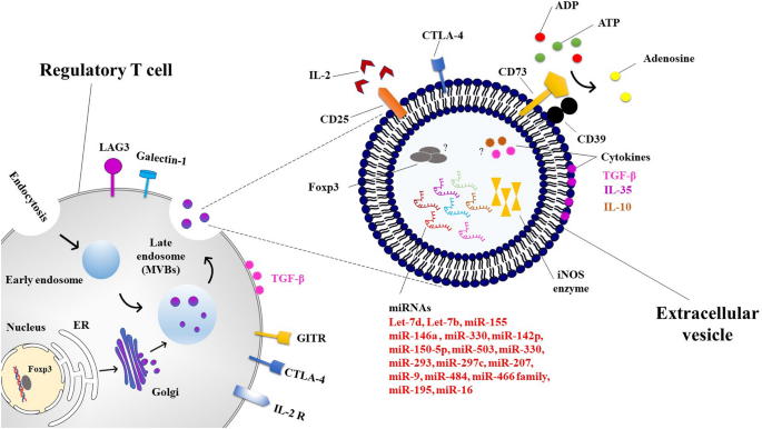 免疫稳态的维持依赖于免疫激活与抑制的精细平衡,调节性T细胞(Treg)是维持免疫耐受、防止自身免疫反应的核心细胞亚群,自1995年首次被明确其免疫抑制功能以来,领域共识:Treg通过接触依赖机制(如细胞毒性T淋巴细胞相关蛋白4(CTLA-4)介导的共抑制信号)和非依赖机制(如分泌白细胞介素-10(IL-10)、转化生长因子-β(TGF-β)等细胞因子)发挥作用。近年来,细胞外囊泡(EVs)作为细胞间通讯的新型介质,因其能携带蛋白质、核酸、脂质等生物活性分子,穿越生物屏障并精准靶向靶细胞,成为免疫调节领域的研究热点。然而,当前领域仍存在核心问题:Treg来源EVs的具体免疫调节成分及作用机制尚未完全阐明,其在自身免疫病和器官移植中的临床转化研究数据匮乏,缺乏统一的分离鉴定标准。本研究旨在系统总结Treg-EVs中关键免疫抑制成分的作用机制,梳理其在动物疾病模型中的研究进展,明确临床转化的挑战与方向,为该领域的后续研究提供全面的参考框架。