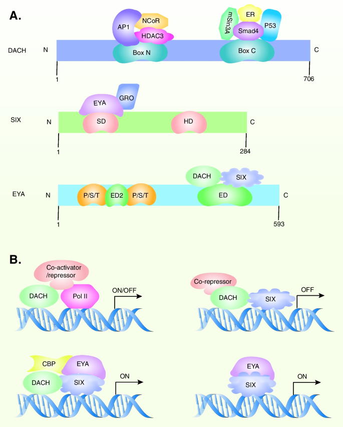 实验目的是明确RDGN核心成员的结构特征及分子调控机制;方法细节是整合已发表的结构生物学研究(如X射线晶体结构分析)、分子互作实验(DNA结合实验、免疫共沉淀分析)及转录调控实验(荧光素酶报告基因分析);结果解读显示,DACH家族包含DACH1和DACH2,均具有两个保守结构域:DD1(可结合DNA)和DD2(负责蛋白-蛋白互作),DACH1可通过结合DNA或转录因子(如c-Jun、Smads)抑制靶基因转录;SIX家族含同源结构域(HD,DNA结合)和SIX结构域(SD,蛋白互作),其中SIX1、SIX3等需EYA作为共激活因子发挥转录调控作用;EYA家族具有酪氨酸磷酸酶、苏氨酸磷酸酶和转录激活三重活性,可通过去磷酸化组蛋白H2AX参与DNA修复,或调控Cyclin D1促进细胞增殖。