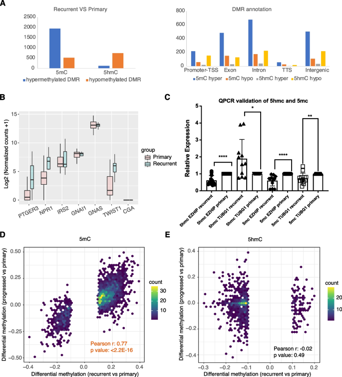 实验目的是明确复发性膀胱癌中表观遗传改变与转录组的关联,揭示5mC和5hmC在膀胱癌复发中的具体功能。方法细节:对比31例原发膀胱癌和9例复发性膀胱癌的RNA-seq、oxRRBS和RRBS数据,鉴定差异表达基因和差异甲基化区域,关联分析5hmC DMRs与脂肪酸代谢相关基因的表达;采用5mC/5hmC特异性qPCR验证TUBG1和EZHIP基因的甲基化/羟甲基化水平。结果解读:转录组分析显示,复发性膀胱癌中上调基因富集于细胞外基质组织、血管生成通路,下调基因富集于氧化应激、PPAR信号通路;表观遗传分析鉴定出1940个5mC高甲基化DMRs、516个5mC低甲基化DMRs、122个5hmC高甲基化DMRs和742个5hmC低甲基化DMRs,其中5hmC低甲基化DMRs富集于脂解调控通路,且与脂肪酸氧化相关基因(如TWIST1、PTGER3等)的转录活性直接相关,部分基因的5hmC水平与表达呈负相关;qPCR验证显示,复发性膀胱癌样本中TUBG1的5hmC水平显著升高,EZHIP的5hmC水平显著降低(文献未明确样本量,P<0.05,基于图表趋势推测),与测序结果一致;此外,5例术后1年内复发患者的5mC甲基化特征与复发性膀胱癌样本一致,提示5mC改变在膀胱癌复发早期即已发生,可作为潜在的复发预测标志物。