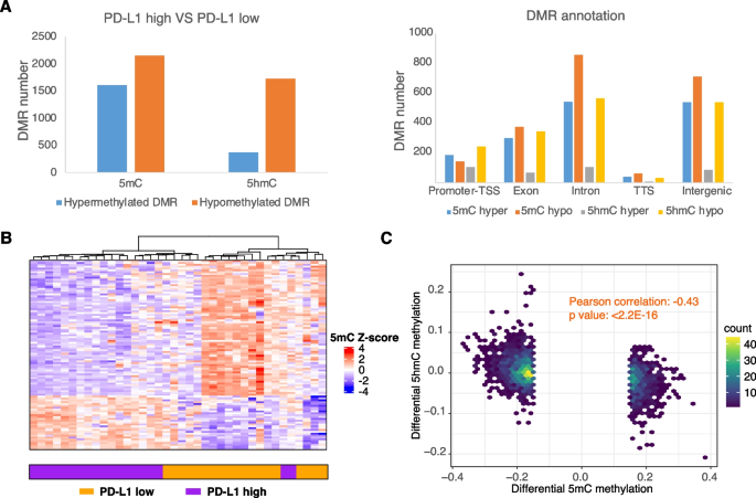 实验目的是阐明PD-L1表达调控的表观遗传机制,鉴定可精准预测PD-L1表达的生物标志物,并比较不同检测技术的效能。方法细节:根据PD-L1表达中位数将膀胱癌样本分为高表达组和低表达组,对比两组的多组学数据,鉴定差异甲基化区域与差异表达基因的关联;构建机器学习模型评估5mC、5hmC及RRBS联合检测的预测效能;采用5mC特异性qPCR验证关键区域的甲基化水平。结果解读:PD-L1高表达样本中鉴定出1589个5mC高甲基化DMRs、2149个5mC低甲基化DMRs、370个5hmC高甲基化DMRs和1725个5hmC低甲基化DMRs,其中5mC低甲基化DMRs关联的基因富集于T细胞迁移、细胞因子应答通路;5mC生物标志物预测PD-L1高表达的AUC值显著高于5hmC和RRBS联合检测,其中NFATC1基因体的一个DMR预测PD-L1高表达的AUC为0.884(文献未明确样本量,基于图表趋势推测);进一步分析显示,5mC和5hmC的甲基化改变呈全局负相关,传统RRBS由于混合两种信号导致甲基化差异的显著性降低,提示单独检测5mC的oxRRBS技术更适合筛选精准的生物标志物。