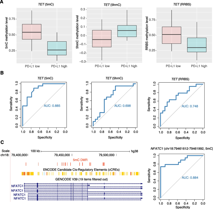 Biomarker定位:该Biomarker属于表观遗传类生物标志物(DNA甲基化修饰),筛选与验证逻辑为:首先通过oxRRBS检测PD-L1高/低表达样本的5mC水平,鉴定差异甲基化区域;然后关联差异表达基因,筛选与免疫调控相关的基因区域;接着通过机器学习模型评估其预测效能,验证其优于5hmC和传统RRBS联合检测的准确性;最后结合功能通路分析,明确其与NFATC1转录活性及PD-L1表达的关联。
