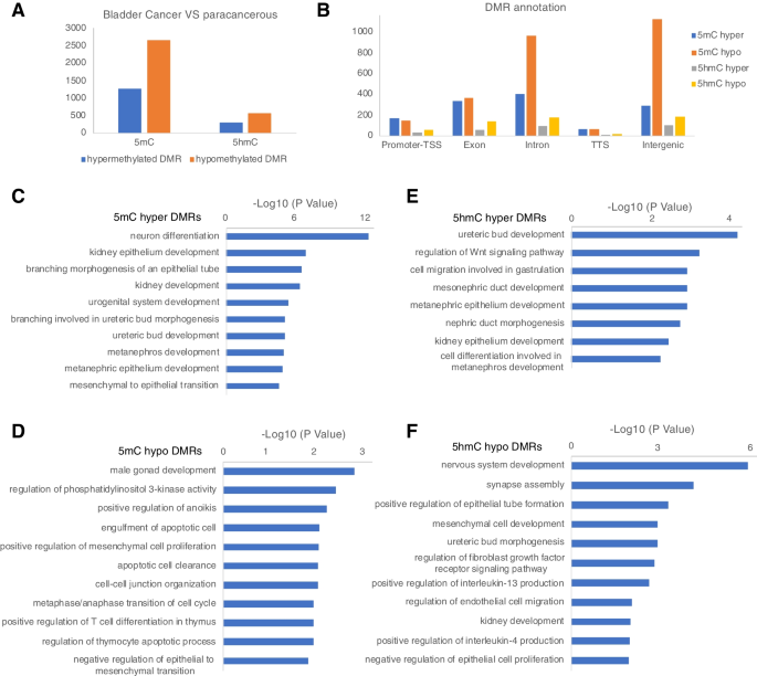 实验目的是解析膀胱癌组织与癌旁组织之间5mC和5hmC的全局改变特征,明确其功能关联通路。方法细节:对比44例膀胱癌组织和10例癌旁组织的oxRRBS和RRBS数据,计算每个CpG位点的5mC和5hmC水平,采用metilene软件鉴定差异甲基化区域(DMRs),其中5mC显著DMRs定义为甲基化差异绝对值>0.2且校正P值<0.05,5hmC显著DMRs定义为甲基化差异绝对值>0.1且校正P值<0.05;通过Enrichr工具进行通路富集分析。结果解读:膀胱癌组织中鉴定出1266个5mC高甲基化DMRs和2666个5mC低甲基化DMRs,高甲基化DMRs富集于泌尿生殖系统发育、肾脏发育通路,低甲基化DMRs富集于细胞周期、PI3K通路及男性性腺发育通路,提示DNA甲基化可能参与膀胱癌性别差异的发生;5hmC方面鉴定出287个高甲基化DMRs和534个低甲基化DMRs,低甲基化DMRs在启动子区域的数量约为高甲基化的5倍,富集于神经系统发育、FGFR信号通路调控及上皮细胞增殖负调控通路,提示5hmC低甲基化可能通过调控上皮间质转化和免疫逃逸促进膀胱癌进展。