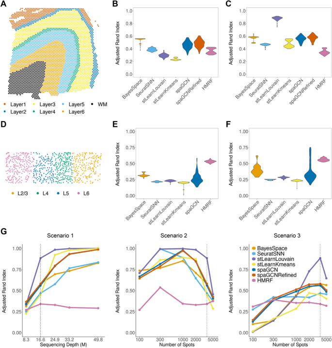 方法细节:选择两个代表性数据集作为参考:非单细胞分辨率的10x Visium人类背外侧前额叶皮层(DLPFC)数据(包含7个组织区域)和单细胞分辨率的STARmap小鼠视觉皮层数据(包含4个皮层层);分别生成组织水平(全组织模拟)和区域水平(分区域模拟后合并)的模拟数据;评估6种主流空间聚类方法(BayesSpace、stLearn Kmeans/Louvain、SpaGCN、HMRF、Seurat SNN)的性能,采用调整兰德指数(ARI)衡量聚类结果与真实区域的一致性;同时设计三种实验参数场景:(I)改变总测序深度、固定位置数量;(II)改变位置数量、固定总测序深度;(III)固定平均测序深度、同时改变位置数量和总测序深度,分析参数对聚类性能的影响;此外,通过合并DLPFC的原始7个区域为3个新区域,分析区域数量和大小对聚类性能的影响。