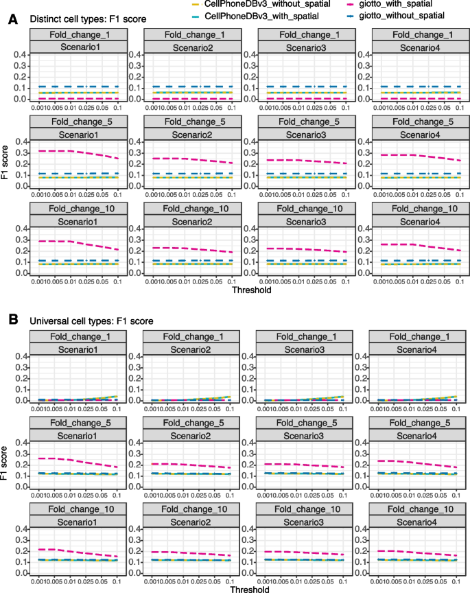 结果解读:带空间信息的Giotto综合性能最优,在异质表达的中度通讯场景中,F1值均值达0.204(n=10,P<0.05);不带空间信息的Giotto召回率最高,而CellphoneDBv3的特异性最高;空间信息的引入显著提升了Giotto的性能,而对CellphoneDBv3的影响较小,说明不同方法对空间信息的利用效率存在差异。