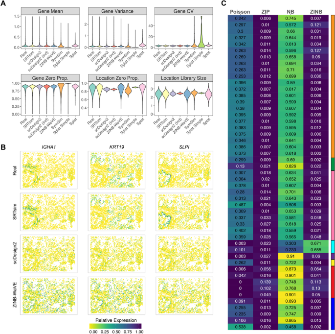 方法细节:SRTsim主要实现两种模拟模式:参考型模拟和无参考型模拟。参考型模拟分为三个核心步骤:第一步,获取或创建合成数据的空间位置坐标,可直接复用参考数据的位置,或根据用户需求生成新位置(通过凹壳算法拟合组织轮廓,再用网格或随机点过程生成指定数量的位置);第二步,针对每个基因,基于参考数据拟合四种计数模型(Poisson、零膨胀Poisson(ZIP)、负二项式(NB)、零膨胀负二项式(ZINB)),选择Akaike信息准则(AIC)最低的模型作为该基因的最优模型,基于模型参数生成表达计数;第三步,按照参考数据中基因的空间表达水平对位置排序,将模拟的表达计数按此顺序分配,确保保留空间模式。无参考型模拟允许用户自定义组织形状(可选预设形状或自定义轮廓)、位置数量、计数模型参数,生成具有指定空间模式的模拟数据。工具以R包形式实现,配套Shiny交互式应用,支持可视化模拟结果。