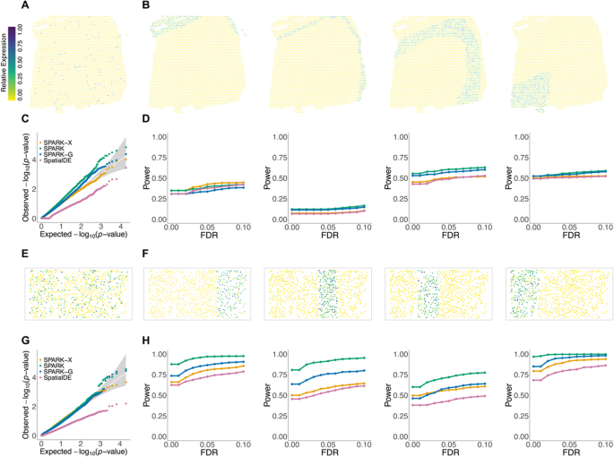 结果解读:零假设场景下,SPARK、SPARK-G、SPARK-X的P值校准良好(Q-Q图接近对角线),而SpatialDE的P值过于保守;备择假设场景下,SPARK和SPARK-G在多数空间模式下的检测功效更高,例如在DLPFC的白质区域模式中,FDR=0.05时功效达0.85以上,而SPARK-X在薄层1的模式中表现更优;检测性能依赖信号强度和区域大小,信号越强、区域越大,检测功效越高,例如DLPFC的薄层2中,信号强度为10倍时的功效是5倍时的1.5倍以上。