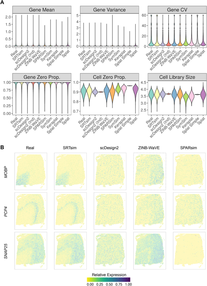 实验目的:验证SRTsim生成的模拟数据在基因表达统计特征和空间表达模式上与真实空间转录组数据的一致性,并与现有单细胞模拟工具进行对比。