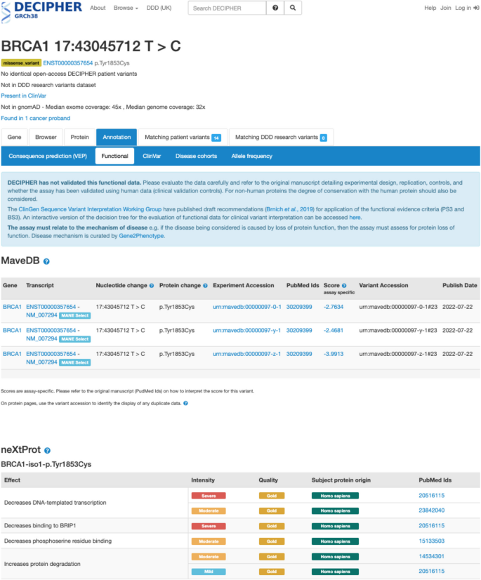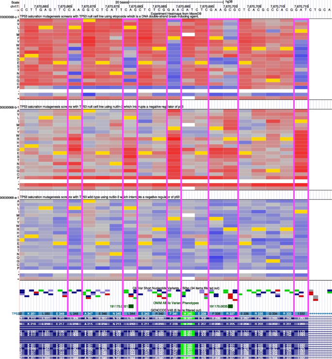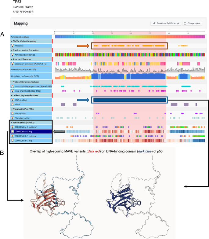 本环节的核心目标是将映射后的多重变异效应分析数据整合到常用的人类基因组学研究与临床变异解读工具中,验证数据的可及性与实用性。研究人员针对不同平台开发定制化整合流程:在Genomics 2 Proteins(G2P)Portal中整合706个得分集,实现多重变异效应分析数据在蛋白序列和三维结构上的可视化;在UCSC Genome Browser中创建自定义track hub,以热图形式展示变异的功能得分;为Ensembl Variant Effect Predictor(VEP)开发专用插件,实现变异注释时自动调用多重变异效应分析数据;在DECIPHER平台的变异页面添加多重变异效应分析功能数据模块;将数据提交到ClinGen Linked Data Hub,通过规范等位基因标识符(CAid)实现数据关联;同时与Shariant平台开展试点整合。结果显示,多重变异效应分析数据可在这些平台中与临床变异数据、蛋白结构数据、保守性数据等整合展示,例如在G2P Portal中,TP53的多重变异效应分析数据与ClinVar中的致病突变区域、蛋白DNA结合结构域高度重叠;在UCSC Browser中可直观对比不同药物处理下TP53变异的功能响应差异;在DECIPHER平台中,BRCA1变异的多重变异效应分析数据可辅助临床变异的致病性评估。