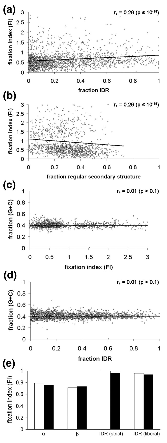 实验目的是从基因整体水平验证内在无序区与正选择的关联。方法细节上,使用McDonald-Kreitman检验计算固定指数(Fixation Index, FI),FI定义为(dN/dS)/(pN/pS),其中dN/dS为物种间非同义与同义替换率的比值,pN/pS为物种内非同义与同义多态性的比值,FI>1表示正选择作用,FI<1表示负选择作用,分析FI与内在无序区含量、有序结构含量的相关性。结果解读显示,FI与内在无序区含量呈显著正相关(相关系数r_s=0.28,n=3746,P≤10^-18),与有序结构含量呈显著负相关(相关系数r_s=-0.26,n=3746,P≤10^-18)(图3a、b);而基因的GC含量与FI、内在无序区含量均无显著相关性(图3c、d)。将基因按FI高低分为两组后,高FI组的内在无序区含量显著高于低FI组(P≤10^-15);对 concatenated的结构区域进行分析显示,内在无序区的FI接近1.0,有序结构区域的FI低于1.0,进一步验证了内在无序区的正选择富集。