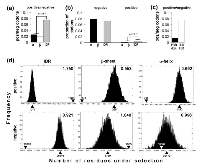 实验目的是检测单个密码子位点的正选择和负选择信号,比较不同结构区域的选择压力差异。方法细节上,使用HyPhy软件中的固定效应似然(Fixed Effects Likelihood, FEL)方法,对3746个基因比对进行分析,计算同义替换率(α)和非同义替换率(β),以β>α作为正选择的判断标准,α>β作为负选择的判断标准,采用P≤0.1作为显著性阈值。结果解读显示,共检测到7561个正选择位点和178408个负选择位点;内在无序区中正选择与负选择位点的比值是有序结构区域的3倍,且内在无序区中正选择位点的比例比有序结构区域高近3倍(n=3746,P≤0.001);长度≥30个氨基酸的长内在无序区中,正选择信号显著强于三级结构域(图2c)。随机化验证结果显示,内在无序区中的正选择位点显著富集(P≤0.001),而负选择位点的分布与有序结构区域无显著差异;此外,528个基因中内在无序区含量与正选择位点数量呈显著正相关(n=528,P≤0.05),仅28个基因呈负相关。