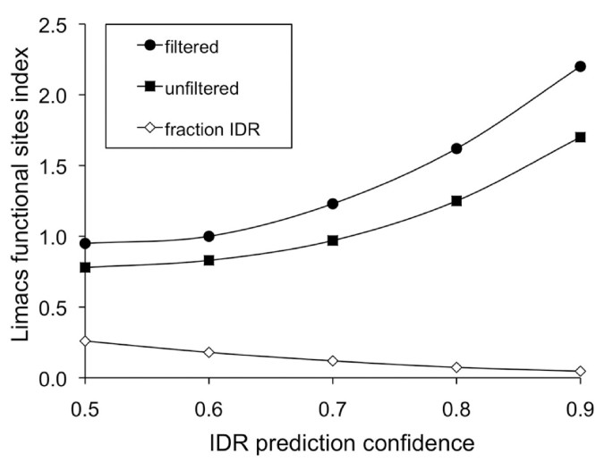 实验目的是排除内在无序区中正选择富集是由于功能位点密度低的可能性。方法细节上,使用Limacs方法预测Pfam结构域中的功能位点,计算Limacs功能位点指数,即(内在无序区中功能位点/内在无序区中非功能位点)/(非内在无序区中功能位点/非内在无序区中非功能位点),分析内在无序区与非内在无序区的功能位点分布差异。结果解读显示,Limacs功能位点指数接近或大于1.0,表明内在无序区中的功能位点密度不低于非内在无序区,且随着内在无序区预测阈值的提高,该指数进一步升高,说明内在无序区中的正选择富集并非因为功能位点少,而是真实的适应性进化信号(图4)。