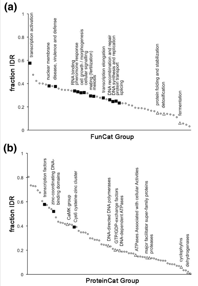 实验目的是分析不同功能类别蛋白质的选择压力与内在无序区含量的关系。方法细节上,使用慕尼黑蛋白质序列信息中心(MIPS)的FunCat和ProteinCat注释系统将基因分类,通过随机化检验检测不同类别中选择位点的富集情况,分析类别平均内在无序区含量与选择压力的相关性。结果解读显示,FunCat分类中,细胞生长、形态发生、信号传导、核酸生物学等类别正选择位点显著富集(P≤0.01),而代谢、蛋白折叠等类别负选择位点富集;ProteinCat分类中,转录因子类别正选择位点显著富集,酶类类别负选择位点富集(图5)。进一步分析显示,正选择富集的类别平均内在无序区含量显著高于负选择富集的类别,转录因子类别位于内在无序区含量排名的顶端(图6),说明高内在无序区含量的蛋白质类别更易受到正选择作用。