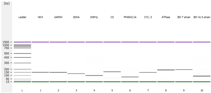 本环节的实验目的是设计并验证用于线粒体数量定量、基因表达分析及病毒载量检测的特异性引物,建立可靠的分子检测方法。方法细节上,利用NCBI引物设计软件设计针对ND4、GAPDH、SDHA、CS等基因及IBV T株的引物,确保至少一条引物跨外显子-内含子连接区,通过Ensemble Chicken Galgal4数据库和BLAST工具验证引物的序列特异性;通过系列稀释的RNA/DNA模板检测引物的扩增效率,利用凝胶电泳验证扩增产物的特异性。结果解读显示,所有引物均可特异性扩增预期大小的产物,凝胶电泳结果显示扩增条带单一且无杂带(图1),引物的扩增效率在94%-104%之间,符合实时荧光定量PCR的实验要求,为后续的线粒体数量定量与基因表达分析提供了技术支撑。实验所用关键产品:NCBI引物设计软件、Agilent 2100生物分析仪、Agilent DNA 1000试剂盒。