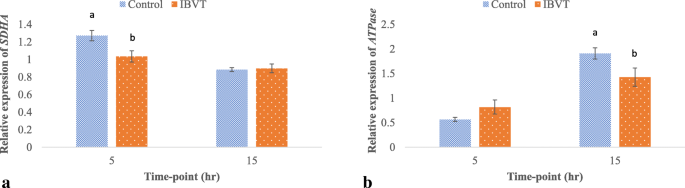本环节的实验目的是解析IBV感染与产蛋时间点对壳腺中核编码线粒体基因表达的影响,明确基因表达与线粒体数量的同步性。方法细节上,提取壳腺组织总RNA,经RNeasy Mini试剂盒纯化后,利用QuantiTect反转录试剂盒反转录为cDNA;通过实时荧光定量PCR检测SDHA、CS、CYC S、Na+-K+ATPase、Drp1、PGC-1α等6个与线粒体生物发生、分裂及功能相关基因的表达水平,以TBP和YWHAZ作为内参基因进行标准化分析。结果解读显示,IBV感染仅显著下调SDHA基因的表达(P<0.05),其余基因的表达在感染组与对照组间无显著差异;产蛋后15h时,CS、CYC S、Na+-K+ATPase的表达水平显著高于5h(P<0.05),SDHA、Drp1的表达水平显著低于5h(P<0.05),PGC-1α的表达无显著时间差异;进一步分析发现,SDHA与Na+-K+ATPase的表达存在IBV感染与产蛋时间点的交互作用,其中SDHA在感染组5h时间点显著下调(P<0.05,图4a),Na+-K+ATPase在感染组15h时间点显著下调(P<0.05,图4b)。这一结果表明,IBV感染仅影响部分核编码线粒体基因的表达,且基因表达与线粒体数量的变化不同步。实验所用关键产品:Qiagen的RNeasy Mini RNA纯化试剂盒、QuantiTect反转录试剂盒、Bioline的SensiFAST SYBR Lo-ROX一步法实时荧光定量PCR试剂盒。