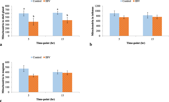 本环节的实验目的是检测IBV感染后蛋鸡输卵管不同区段(壳腺、峡部、膨大部)的线粒体数量变化,明确线粒体数量的组织特异性响应。方法细节上,记录蛋鸡的产蛋时间,分别在产蛋后5h和15h采用CO₂ euthanize鸡只,无菌采集输卵管三个区段的组织样本;利用TRIsure试剂提取组织总DNA,经纯化后通过实时荧光定量PCR检测线粒体DNA(mtDNA)中ND4基因与核DNA(gDNA)中GAPDH基因的拷贝数,以mtDNA拷贝数与gDNA拷贝数的比值代表每个细胞的线粒体数量。结果解读显示,IBV感染仅显著降低壳腺部位的线粒体数量(P=0.0050,图3a),而峡部和膨大部的线粒体数量在感染组与对照组间无显著差异(P=0.2577、P=0.0879,图3b、c);同时,线粒体数量在产蛋后5h与15h时间点间无显著变化,表明IBV对线粒体数量的影响具有组织特异性,且不受产蛋周期的干扰。实验所用关键产品:Bioline的TRIsure核酸提取试剂、ThermoFisher Scientific的Nanodrop-8000核酸分析仪、Qiagen的Rotor-Gene Q实时荧光定量PCR仪。