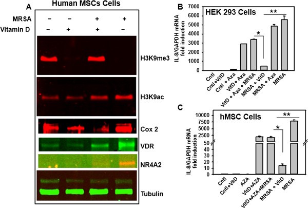 方法细节:hMSCs预先用100 nM 1,25(OH)₂D₃处理24小时,再与MRSA共培养24小时,通过Western Blot检测组蛋白H3K9me3、H3K9乙酰化(H3K9ac)及环氧合酶-2(Cox-2)、NR4A2、VDR的蛋白表达;用DNA甲基转移酶抑制剂5-氮杂-2"-脱氧胞苷(5-dAZA)处理细胞后,qPCR检测IL-8的mRNA表达。