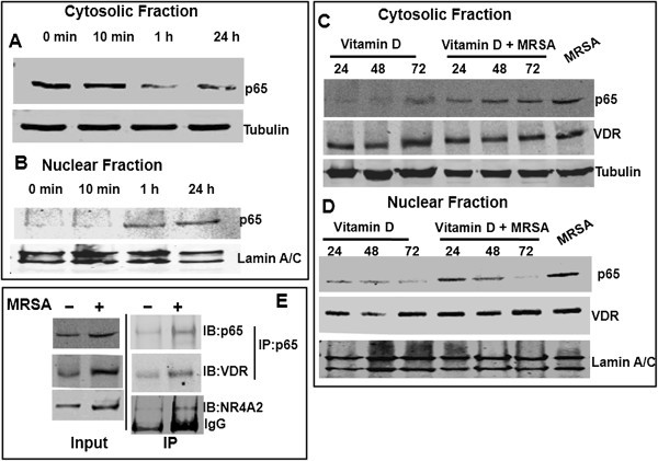方法细节:hMSCs预先用100 nM 1,25(OH)₂D₃分别处理24、48、72小时,再与MRSA共培养24小时,通过核质分离试剂盒提取核蛋白与胞质蛋白,Western Blot检测NF-κB-p65的核转位水平;免疫共沉淀实验检测NF-κB-p65、维生素D受体(VDR)与NR4A2的相互作用。