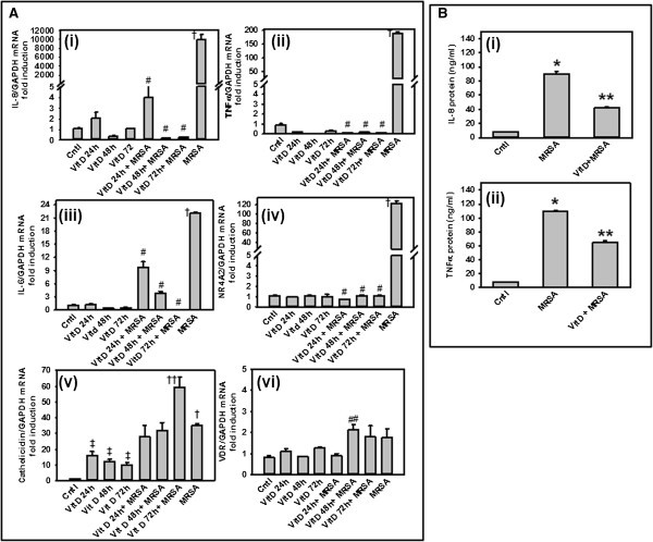 方法细节:hMSCs预先用100 nM 1,25(OH)₂D₃分别处理24、48、72小时,再与MRSA共培养24小时,通过qPCR检测IL-6、IL-8、TNF-α、NR4A2、VDR、Cathelicidin的mRNA表达;酶联免疫吸附实验(ELISA)检测细胞培养上清中IL-8、TNF-α的蛋白分泌水平。