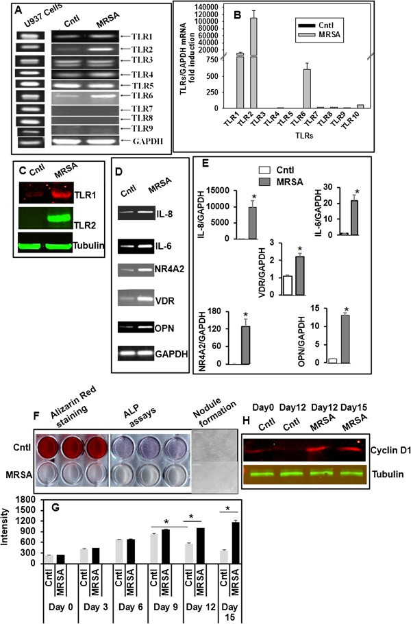 方法细节:从成人骨髓中分离培养hMSCs,设置对照组(无MRSA感染)与MRSA共培养组(感染复数MOI=1:100),通过半定量反转录PCR(RT-PCR)、实时定量PCR(qPCR)检测TLRs mRNA表达,蛋白质免疫印迹(Western Blot)检测TLRs蛋白表达;成骨分化实验采用含地塞米松的成骨培养基培养细胞15天,通过茜素红染色、碱性磷酸酶活性检测评估成骨能力,DRAQ5染色结合红外扫描检测细胞增殖水平,Western Blot检测周期蛋白D1表达。