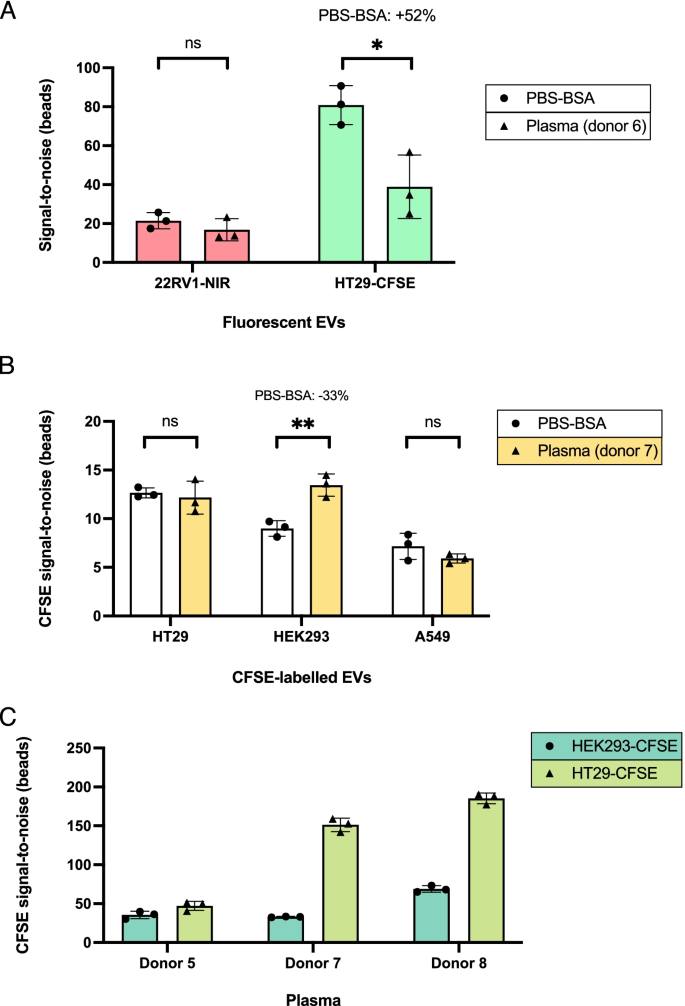 结果解读:不同细胞来源的细胞外囊泡回收率存在显著差异,HT29细胞外囊泡在不同血浆样本中的回收率差异达3倍(n=3,P<0.05),HEK293细胞外囊泡在部分血浆样本中的回收率高于简单基质,表明细胞外囊泡表面表型和血浆基质组成共同影响分离效率;孵育60min时回收率最高,血浆稀释对回收率无显著影响(n=2,P>0.05)。