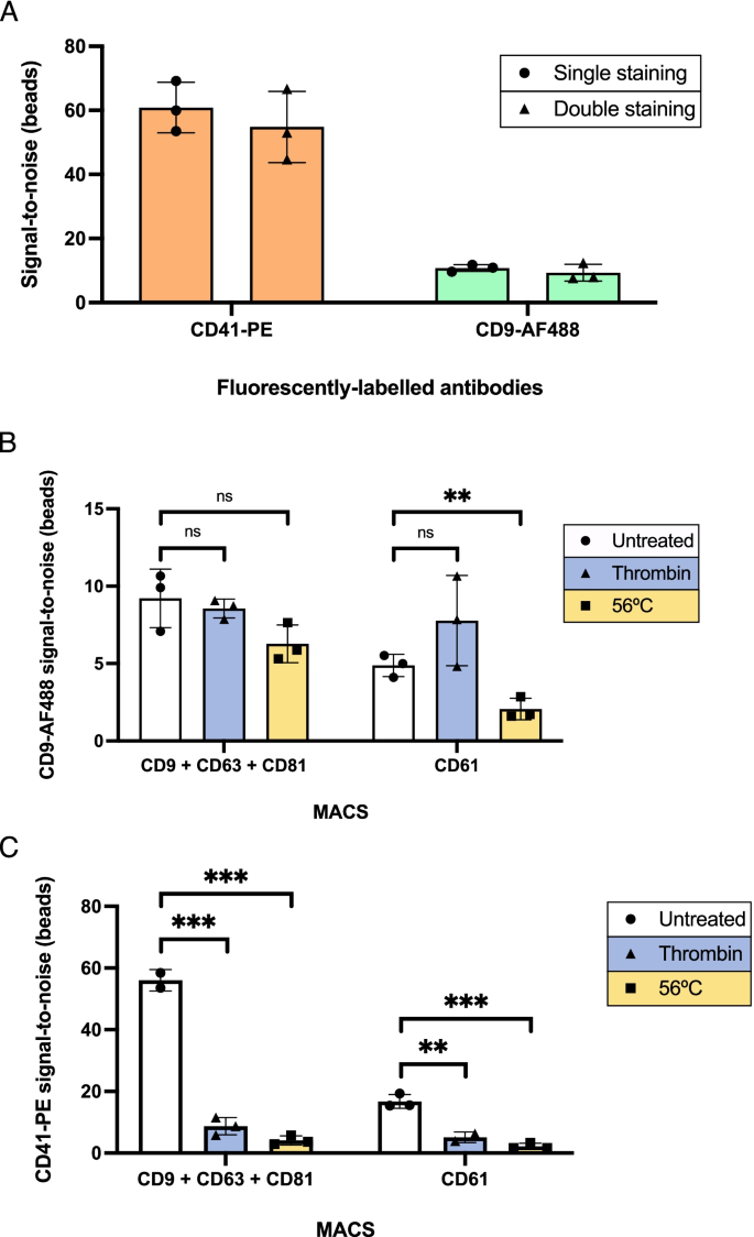 方法细节:用MACS磁珠分离血浆中的细胞外囊泡后,直接在磁珠上进行荧光抗体染色(如CD41-PE、CD9-AF488),通过酶标仪检测荧光信号;采用凝血酶处理或56℃加热处理血浆,分离血小板来源细胞外囊泡后检测标志物表达变化,验证检测的特异性;同时进行双标记染色,评估多标志物检测的可行性。