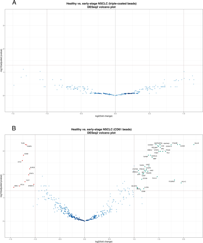 方法细节:从14例健康人和14例早期NSCLC患者的血浆中,分别分离CD9/CD63/CD81+细胞外囊泡亚群和CD61+细胞外囊泡亚群;采用NanoString nCounter平台对594个免疫相关基因的mRNA表达进行检测,通过生物信息学流程(质量控制、低表达基因过滤、标准化、差异表达分析)分析两组样本的基因表达差异。