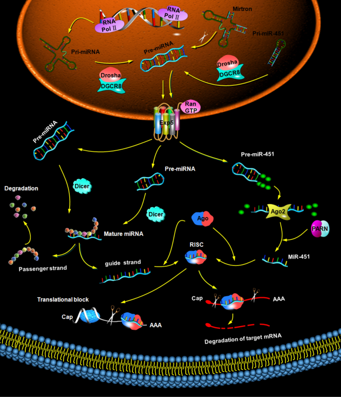 本环节的核心目的是为后续阐述微小RNA调控PNI的机制奠定基础。方法上通过梳理经典和非经典微小RNA生物发生途径的相关文献,总结微小RNA的生成过程及功能。结果显示,微小RNA是长度18-25nt的单链非编码RNA,经典途径由Pol II转录生成pri-miRNA,经Drosha/DGCR8复合物切割为pre-miRNA,再由Exportin 5转运至细胞质,经Dicer切割为成熟双链,其中引导链整合入RISC复合物,通过靶向mRNA的3’-UTR降解或抑制翻译,调控细胞增殖、分化、凋亡等生理病理过程;非经典途径包括Drosha非依赖和Dicer非依赖途径,如mirtron基因通过mRNA剪接形成pre-miRNA,miR-451家族由Ago2切割成熟。