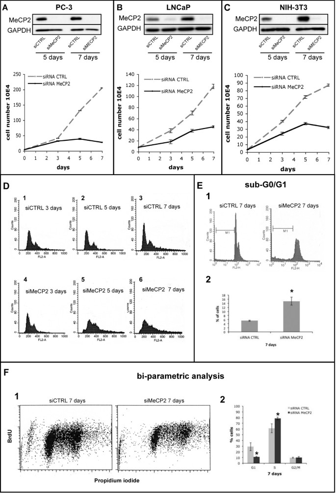 方法细节:在NIH-3T3、PC-3、LNCaP细胞中,采用Dharmacon的MeCP2 siRNA SMARTpool进行转染,设置非靶向siRNA作为对照组,分别在转染后3、5、7天进行细胞计数检测增殖;同时采用流式细胞术(FACS)分析细胞周期分布,通过BrdU/PI双参数染色检测S/G2M期细胞比例,所有实验独立重复3次。