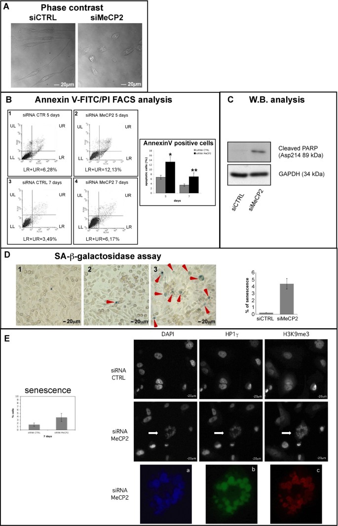 结果解读:如图2所示,MeCP2敲低后凋亡细胞比例虽略有升高,但最高仅约12%(n=3,P<0.001),Cleaved-PARP表达水平无显著升高;SA-β-半乳糖苷酶阳性细胞比例约为4.4%,SAHFs阳性细胞比例约为4%,远低于增殖抑制的幅度,表明凋亡与衰老并非细胞增殖下降的主要原因,核膜结构异常可能是核心调控因素。